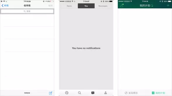 缺省頁面,是出現在用戶沒有提交任何資料或者網絡連接不通暢的情況下所展現的頁面。通常設計師們習慣用豐富的數據內容把頁面設計得美觀實用,考慮的都是界面展現的“理想狀態”,往往會忽視沒有內容的“缺省狀態”。未經過精心設計的缺省頁面降低了用戶的使用體驗,并可能給用戶帶來困擾,如下圖iOS系統郵件App,無郵件時界面上沒有任何有效反饋信息,用戶不能明確得知到底是網絡問題還是賬號同步出錯亦或者是收件箱內確實一封郵件都沒有。同樣的情況也出現在Pinterest和出發吧的界面里。
