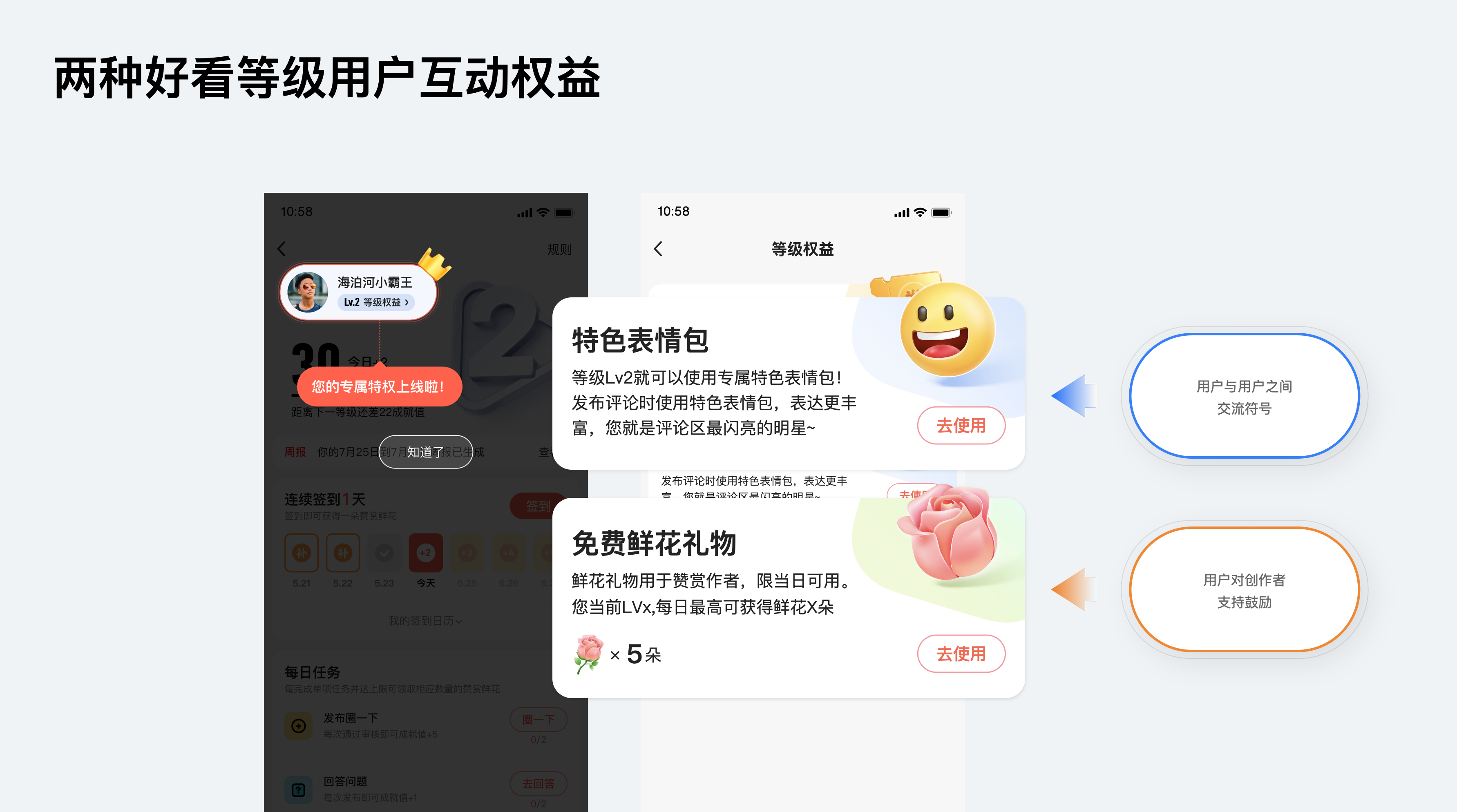 因此在精神激勵的虛擬權益上,好看平臺希望能夠打造一款有記憶點的互動方式,一方面;用戶之間的主要互動場景是評論區,因此權益之一是打造符合好看人群特征的互動表情,創造平臺特有的互動語言來加強用戶交流;另一方面好看的內容創作者一般為多平臺創作者,需要讓創作者在好看平臺上感受到用戶差異,激發創作動力,因此也塑造了用戶等級下的另一個權益“鮮花禮物”。作者使用被打賞的鮮花可以進行流量曝光的兌換,形成了一個用戶側互動激勵與創作者側的良性互動。