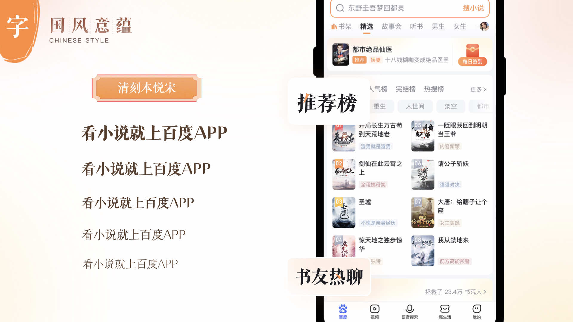 基于國風(fēng)意韻感,設(shè)計團(tuán)隊在文字的使用上,也選擇了一套襯線體字體,該字體字形瘦長,柔美清透且識別度高。在界面中,主要在標(biāo)題區(qū)應(yīng)用這套字體,將其中的一筆進(jìn)行跳色點(diǎn)綴,不僅讓用戶閱讀舒適,而且提升百度小說的品牌識別度。