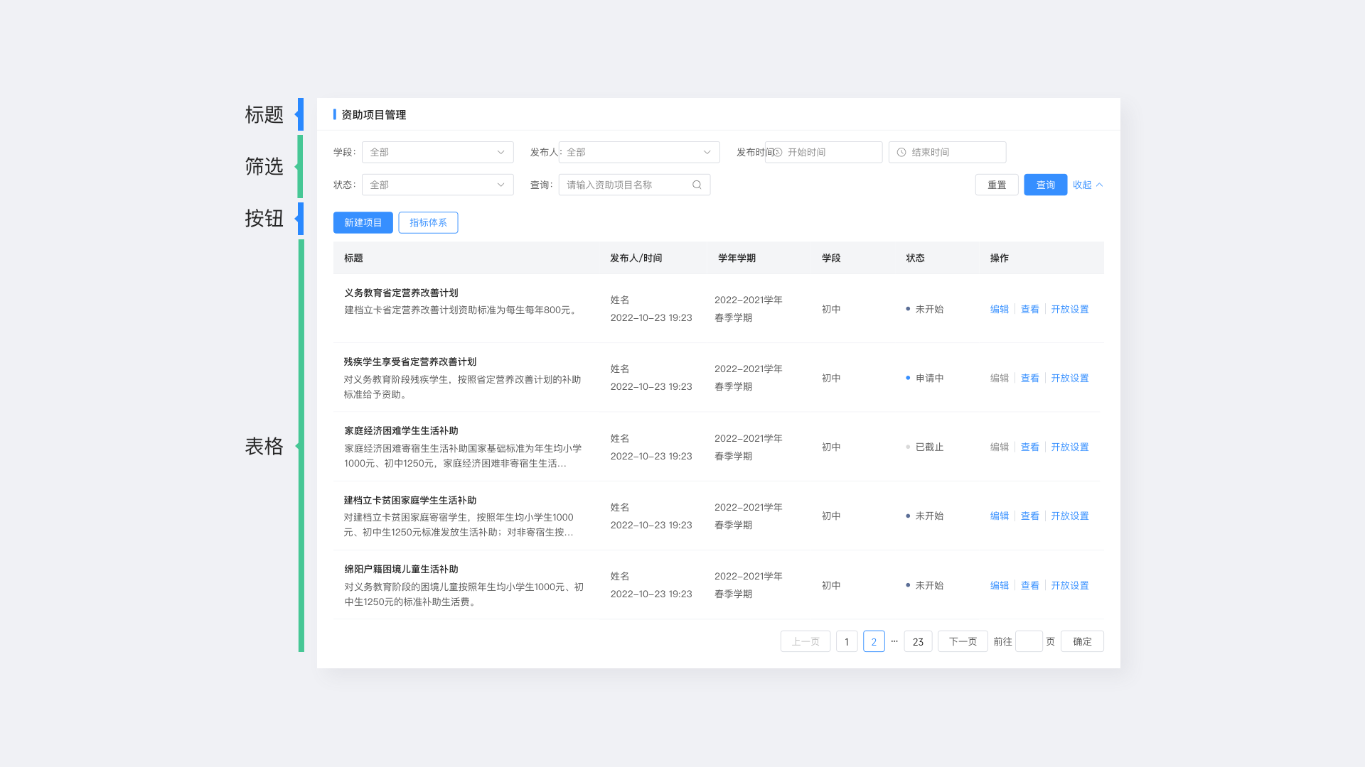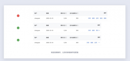 表格設計中一定不要使用過多的顏色區做狀態或操作的區分,過多的顏色細分會使表格變得更加混亂,影響用戶體驗。對狀態的區分,僅用輕量的顏色區分即可,操作欄保持主色按鈕色。
