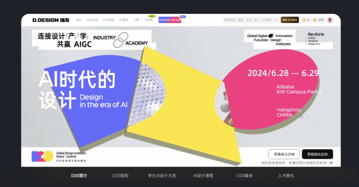 如果 B 端產品缺少體驗設計環節,其落地呈現的往往只是研發邏輯,而非用戶需求和心智,無法提供合理的人機交互。體驗設計能打開用戶需求和心智的世界,讓用戶感受到產品是為自己量身定制的。由 Alibaba Design 發起的 D20 全球設計院長峰會官網首頁設計就很符合用戶心智,畫面簡潔時尚又不失動感,十分耐看。而且人性深處更容易被動態的事物吸引,下方的導航欄設計也很貼心,在電腦屏幕中完整展示,用戶想查看哪個部分,直接點擊對應的導航欄就能精準跳轉,無需長時間拖拽。