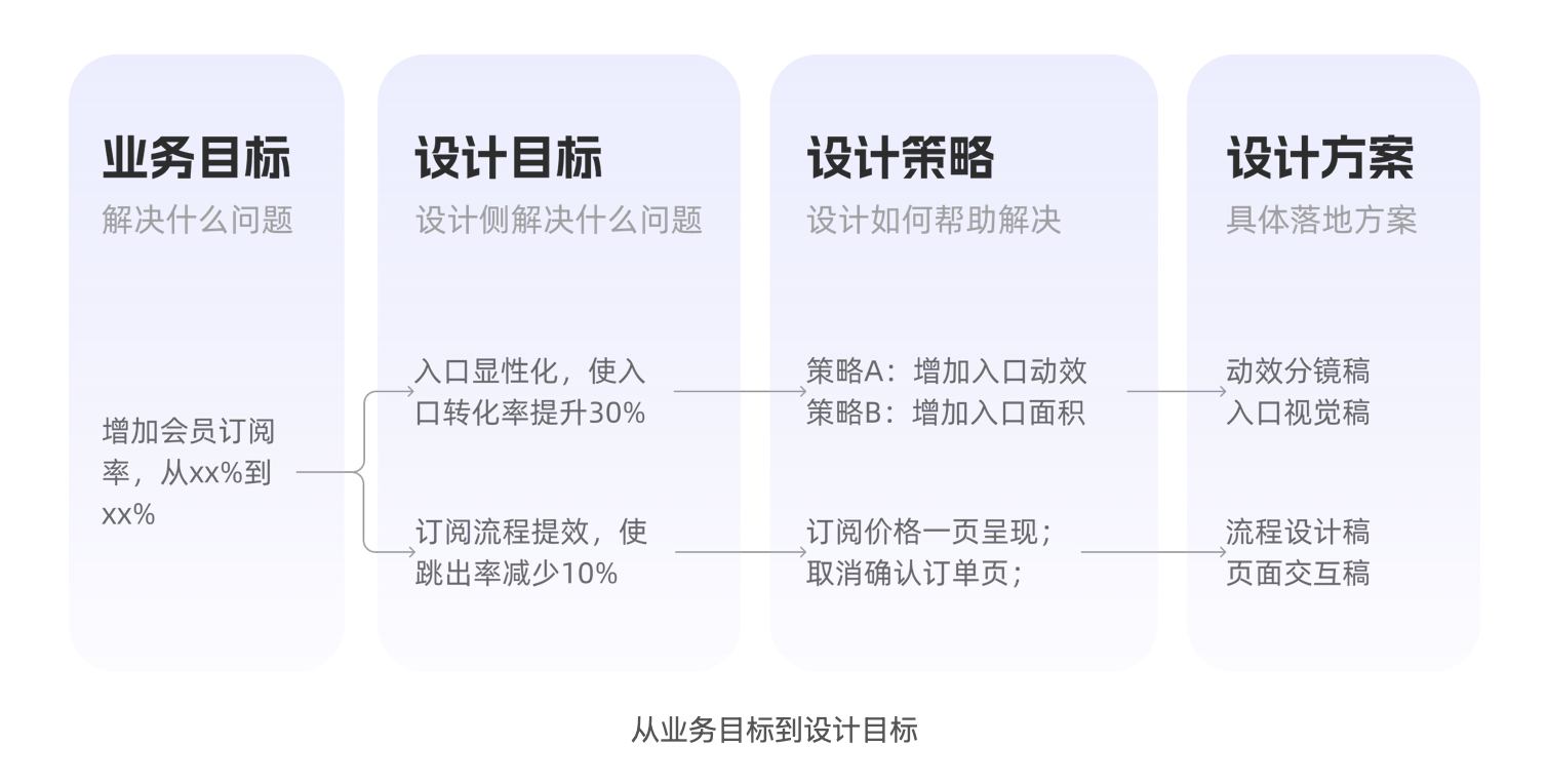 設計目標必須是 “設計側能獨立影響、可量化” 的指標。比如從 “提升訂閱率” 拆解出兩個設計目標:“會員入口點擊率提升 30%”“訂閱流程跳出率降低 20%”,這兩個指標能直接通過設計優化實現,也便于后續評估設計價值。