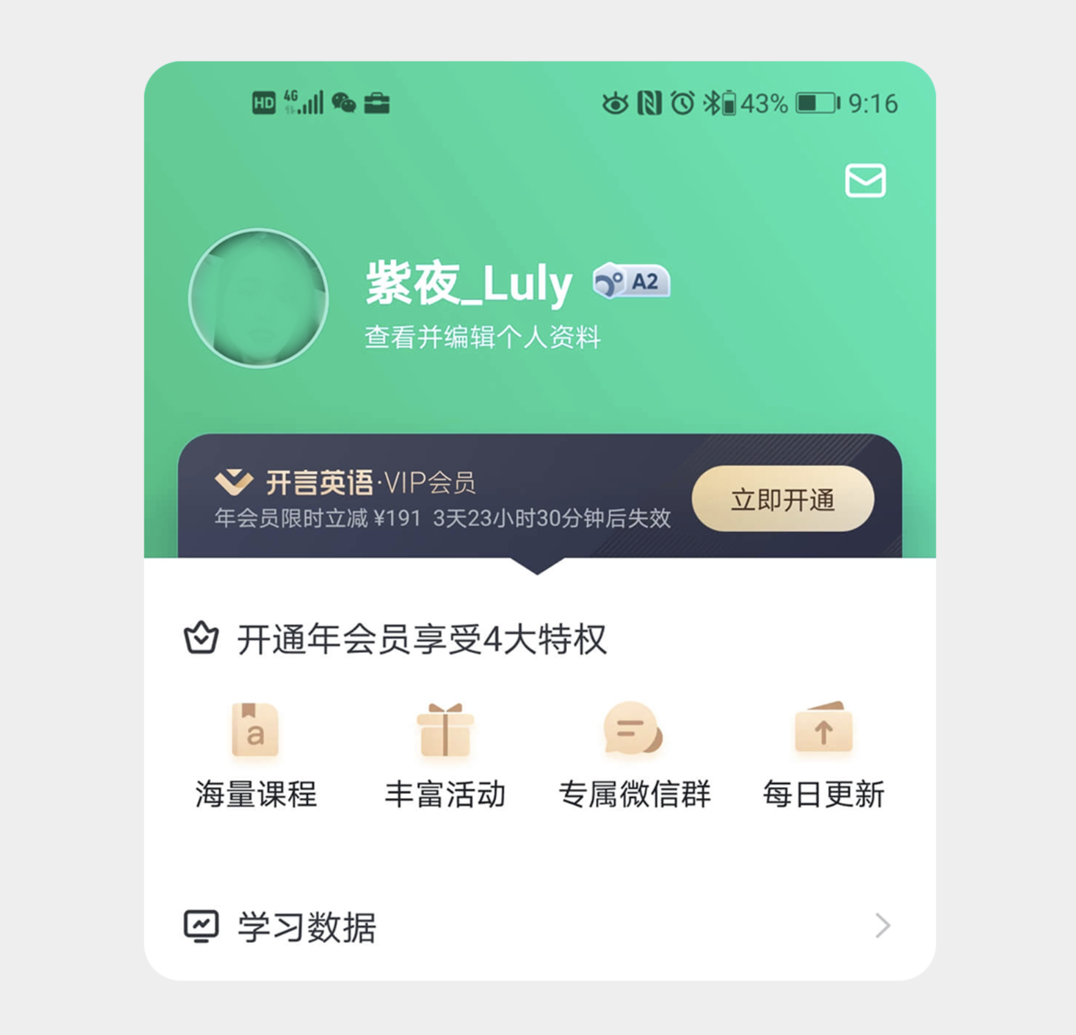 開言英語的 VIP 會員開通頁面,以簡潔有力的形式感突出核心價值。頁面聚焦 “年會員限時立減” 的優(yōu)惠信息,用醒目字體強調(diào)折扣力度和時效,瞬間抓住用戶注意力。