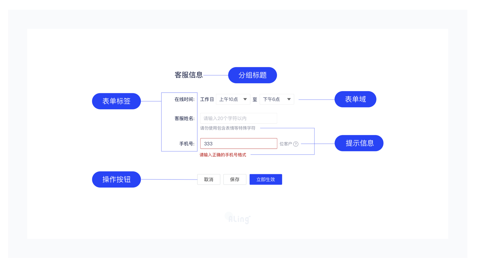- 占位符:輸入框內的臨時提示,避免 “正確的廢話”,如 “商品編號:6-10 位數字”;