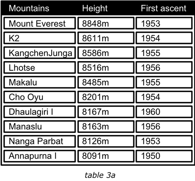 表格中的項目應該通過某種排序的手段來滿足閱讀者的興趣。我們來看下面的兩個表格,左面的展示了世界上最高的十座山峰,鑒于“高度”最受關注,那么表格的項目就是按照這個字段降序排列的。這樣最受關注的信息能夠排在表格的最前面。