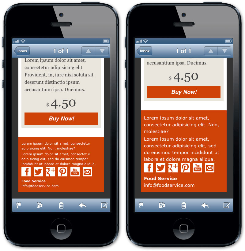 嚴禁復雜 —— 尤其是在郵件上。始終避免使用復雜的結構,否則在小屏幕上渲染時一定會失敗。請記住許多設備是不支持媒體查詢的(例如谷歌郵件),所以我們不能指望成熟的內容重排技術。