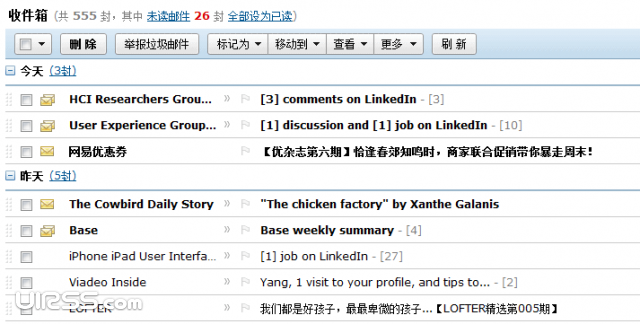 收件箱中,將未讀郵件文字加粗以區(qū)分已讀郵件,也是充分利用了相似原則。