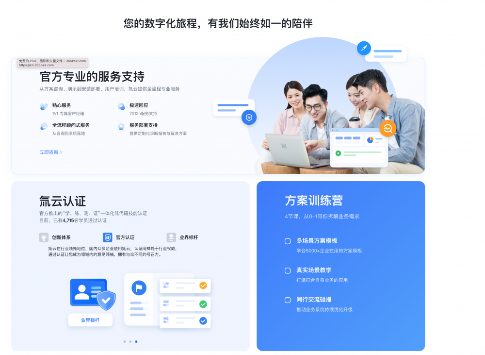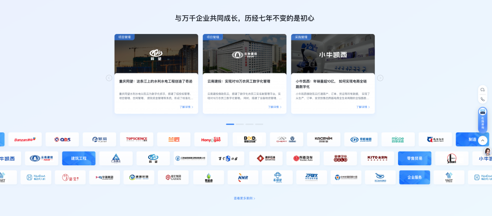 • 用案例 / 故事建立信任:像案例里的 “用戶故事”“客戶案例” 板塊,用真實人物 / 企業的使用場景(如 “35 歲地產人轉型”“云南建投數字化管理”),比單純的功能列表更有說服力。