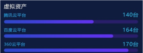 “資產綜合分析”模塊,以部門為單位,對企業“物理資產”“虛擬資產”“應用資產”數量統計分析,并展示各部門內不同資產類型的比例關系和總量。在設計版本中,我們改變模塊內的布局和交互方式,以雷達圖方式展示部門內部不同資產類型的數量關系和總量,并通過顏色來區分不同部間的數據。內容擴展性方面,采用左右橫向翻頁樣式,可自由設定系統自動翻頁切換和手動點擊切換,不僅豐富了頁面展示方式,又增加交互趣味性,數據切換過程中動效的使用也進一步增加界面的科技感和“數據之美”。